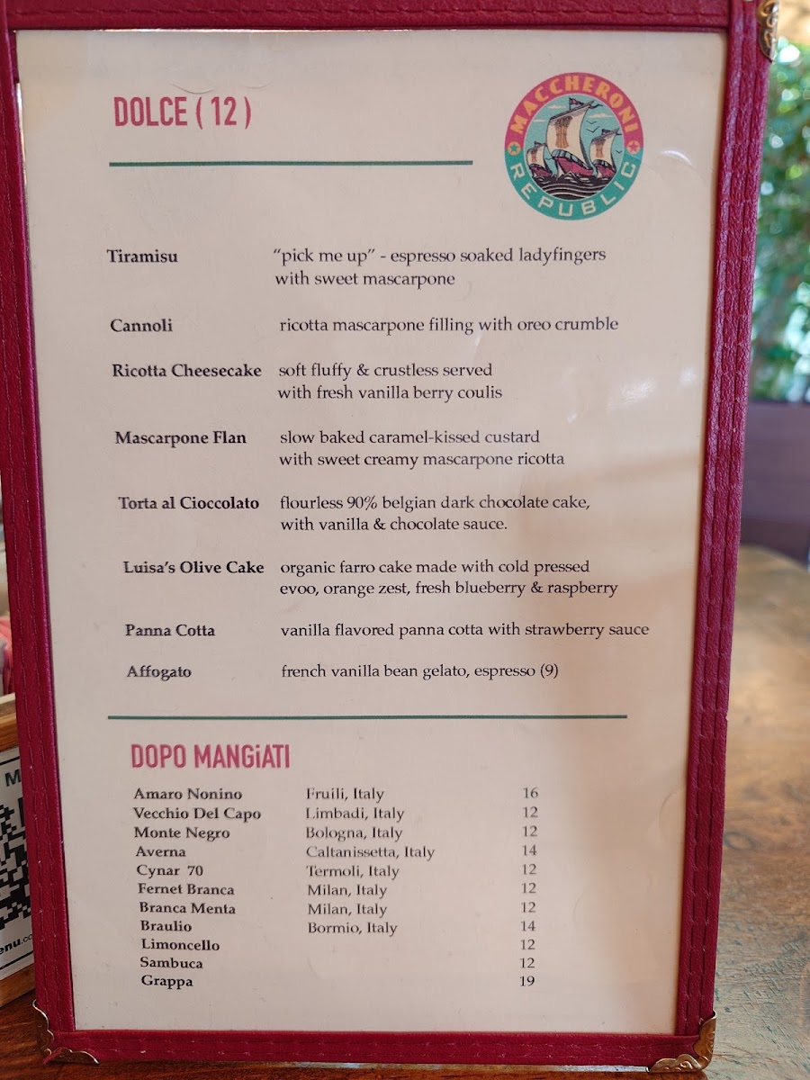 The menu at Maccheroni Republic offers a variety of Italian dishes centered mainly around pasta and traditional preparations. It is organized into several key sections, including specials, pastas, stuffed pastas, and desserts, providing a range of options for different preferences.